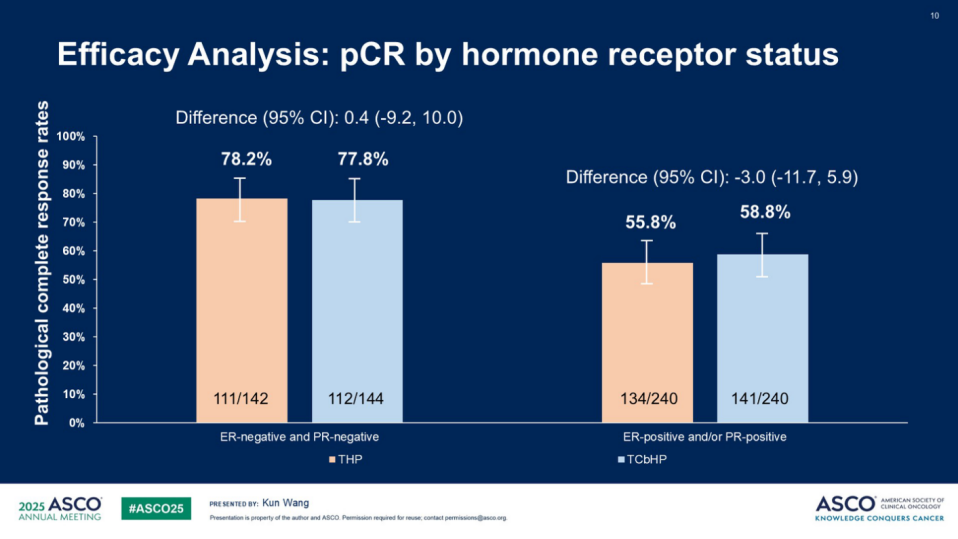 在主要研究终点方面,THP组245例(64.1%,95%CI59.2-68.8)患者达到病理完全缓解(pCR),TCbHP组253例(65.9%,95%CI61.0-70.5)患者达到pCR,绝对差异-1.8%,95%CI-8.5-5.0;优势比(OR)0.93,95%CI0.69-1.25;p=0.0089,表明THP在pCR率上非劣效于TCbHP。进一步根据激素受体状态进行分层,在ER-/PR-亚组中,THP组和TCbHP组的pCR率分别达到了78.2%和77.8%;在ER+/PR+亚组中,两组pCR率分别为55.8%和58.8%,无显著差异,其他各亚组分析结果也基本一致。上述研究结果提示,“去卡铂”降阶梯THP方案是一种安全有效的新辅助治疗策略,对于临床中对卡铂耐受性较差或预期对靶向治疗反应良好的患者,这一研究结果为考虑去除铂类药物提供了依据。
